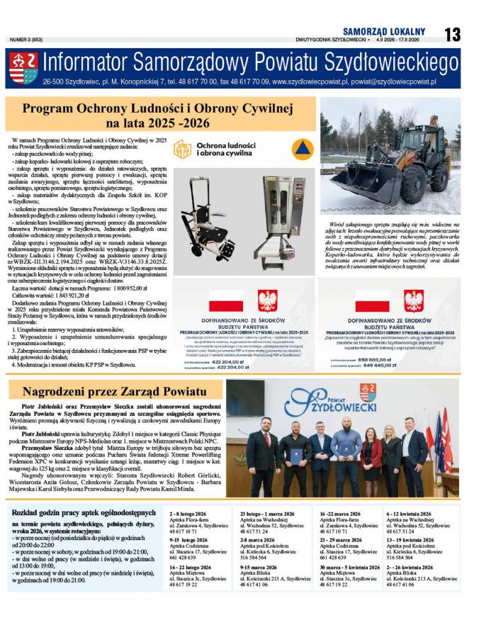 Poniżej przeczytacie informacje ze Starostwa Powiatowego w Szydłowcu, zamieszczone w nr 1 Dwutygodnika Szydłoweckiego z 4 lutego 2026 r.