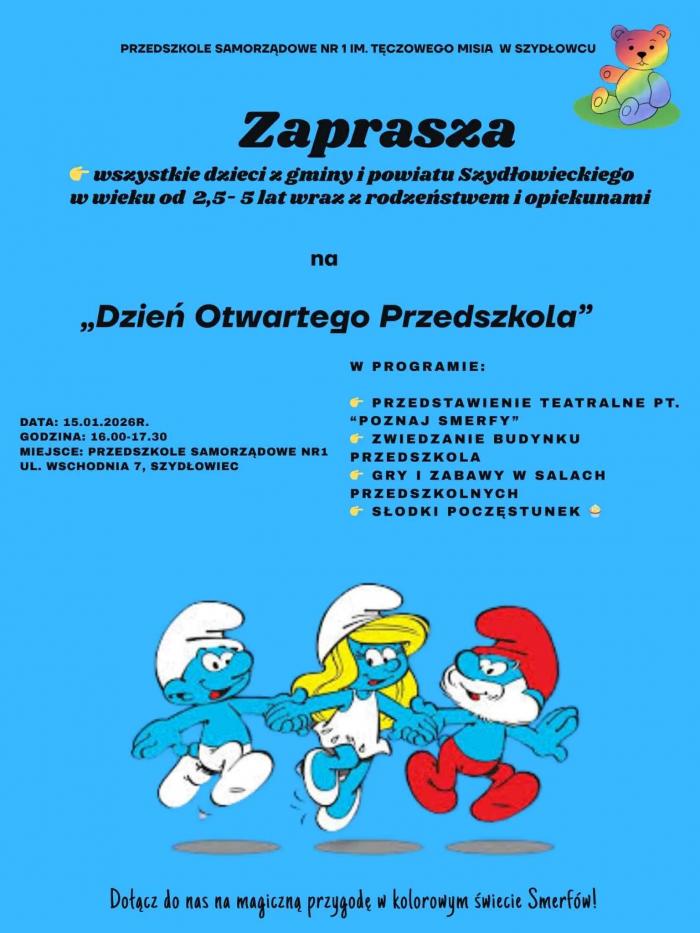W programie wydarzenia m.in. przedstawienie teatralne pt. „Poznaj Smerfy”, możliwość zwiedzania przedszkola, liczne gry i zabawy w salach przedszkolnych oraz słodki poczęstunek.