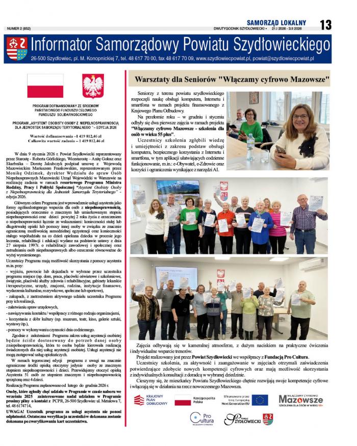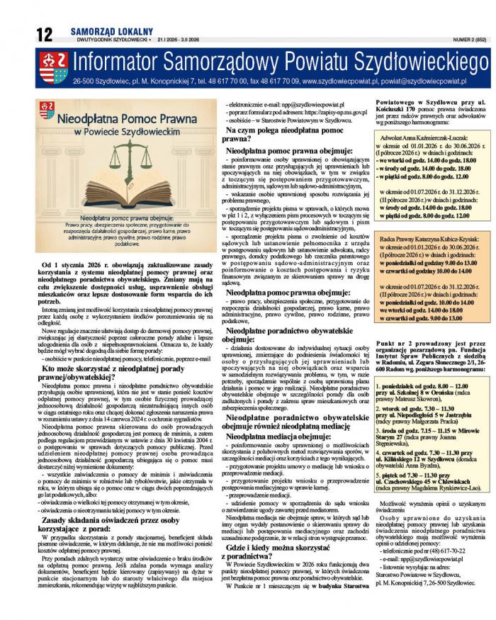 Poniżej przeczytacie informacje ze Starostwa Powiatowego w Szydłowcu, zamieszczone w nr 2 Dwutygodnika Szydłoweckiego z 21 stycznia 2026 r.