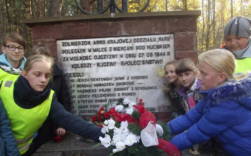 Uczniowie i nauczyciele starszych klas z Publicznej Szkoły Podstawowej im. Jana Kochanowskiego w Budkach odwiedzili pomnik poległych w sierpniu 1944 r. żołnierzy Armii Krajowej pod Huciskiem.