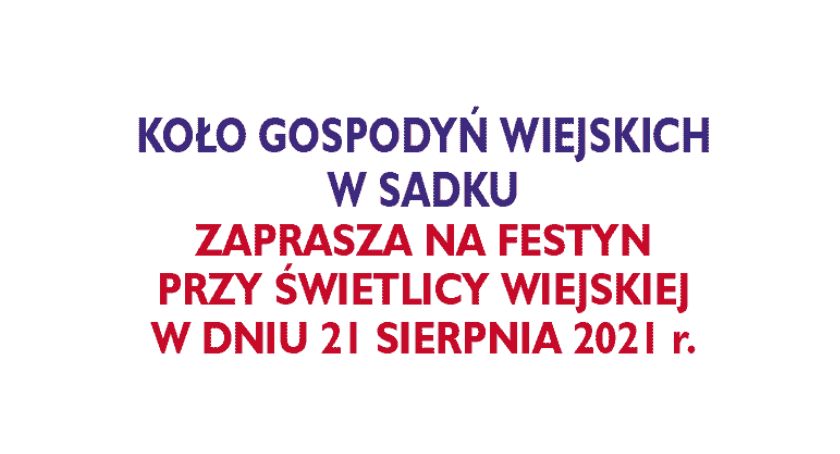 KOŁO GOSPODYŃ WIEJSKICH w Sadku zaprasza na FESTYN przy świetlicy wiejskiej w dniu 21.08.2021r.