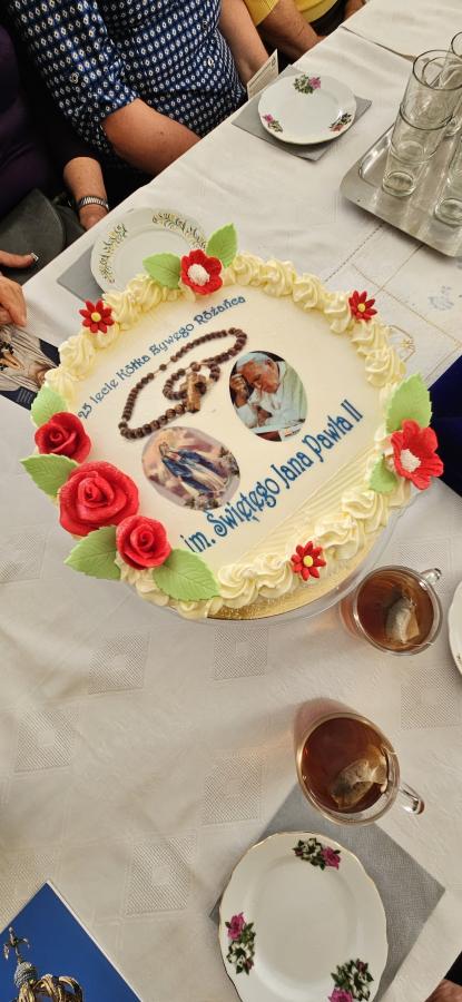 Galeria zdjęć z wyjątkowego spotkania jubileuszowego Koła Żywego Różańca im. św. Jana Pawła II w Szydłowcu. W uroczystości wzięły udział członkinie Koła, ksiądz proboszcz Tadeusz Mazur oraz pani Urszula Wanat – zelatorka Koła. Modlitwa, wspomnienia i gratulacje przeplatały się z radością i wdzięcznością za 25 lat wspólnej modlitwy. Tort jubileuszowy i wspólny posiłek dopełniły chwili wspólnoty. Zdjęcia ukazują atmosferę tego wyjątkowego spotkania oraz wdzięczność za codzienny różaniec – modlitwę za Kościół, Ojczyznę i parafię. Matka Boża Różańcowa niech Was wszystkich otacza swoją opieką!