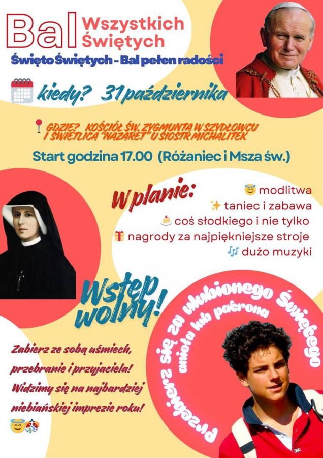 Zapraszamy na Bal Wszystkich Świętych - pełen radości bal, który odbędzie się 31 października w Kościele św. Zygmunta w Szydłowcu oraz świetlicy Nazaret u Sióstr Michalitek. Rozpoczynamy o godzinie 17.00 od Różańca i Mszy św. Czekają na Ciebie modlitwa, taniec, słodkości, konkurs na najpiękniejsze przebrania, nagrody i wiele muzyki. Wstęp wolny! Przyjdź z uśmiechem, przebraniem i przyjacielem! Przebierz się za ulubionego Świętego i baw się razem z nami na najbardziej niebiańskiej imprezie roku!
