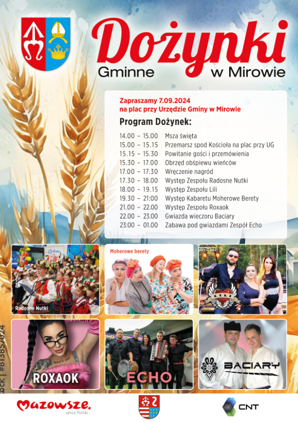 Zapraszamy do obejrzenia galerii zdjęć z uroczystości Dożynek, które odbyły się na placu przy Urzędzie Gminy w Mirowie. Zobacz wielobarwne wieńce, nagrody wręczane gospodarzom, oraz energiczne występy artystów, takich jak Zespół Radosne Nutki, Lili, kabaret Moherowe Berety, Roxasok i wieczorny koncert gwiazdy wieczoru - Baciary. Odkryj atmosferę tego wyjątkowego wydarzenia!