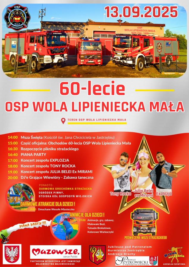 Zapraszamy do obejrzenia zdjęć z uroczystych obchodów 60-lecia OSP Wola Lipieniecka Mała, które odbyły się 13 września 2025 roku. Na terenie jednostki odbyła się msza święta, część oficjalna i strażacki piknik z wieloma atrakcjami - Piana Party, koncerty zespołów Explozja, Tony Rocka i Julia Belei ex Mirami, oraz zabawa taneczna z DJami Grające Wiewióry. Dla najmłodszych były przygotowane darmowe atrakcje jak wesołe miasteczko, animacje, gry, malowanie buzi i kolorowe warkoczyki. Uczestnicy mogli także skosztować tradycyjnej strażackiej grochówki, odwiedzić ogródek piwny i stoiska Kół Gospodyń Wiejskich. Wydarzenie miało patronat Burmistrza Jastrzębia, Andrzeja Bracha, oraz było wspierane przez Samorząd Województwa Mazowieckiego.