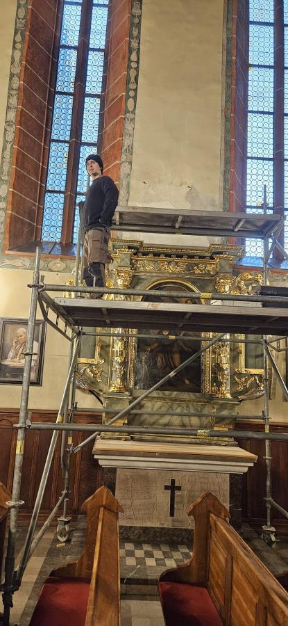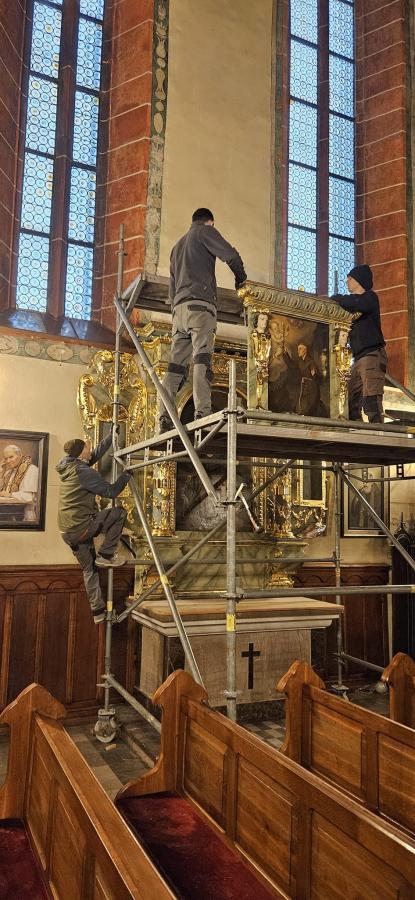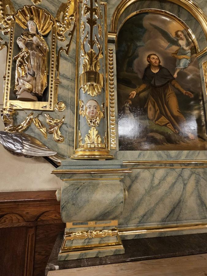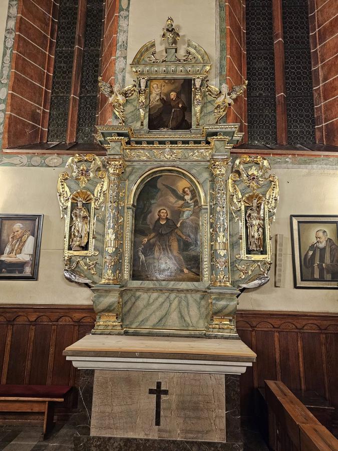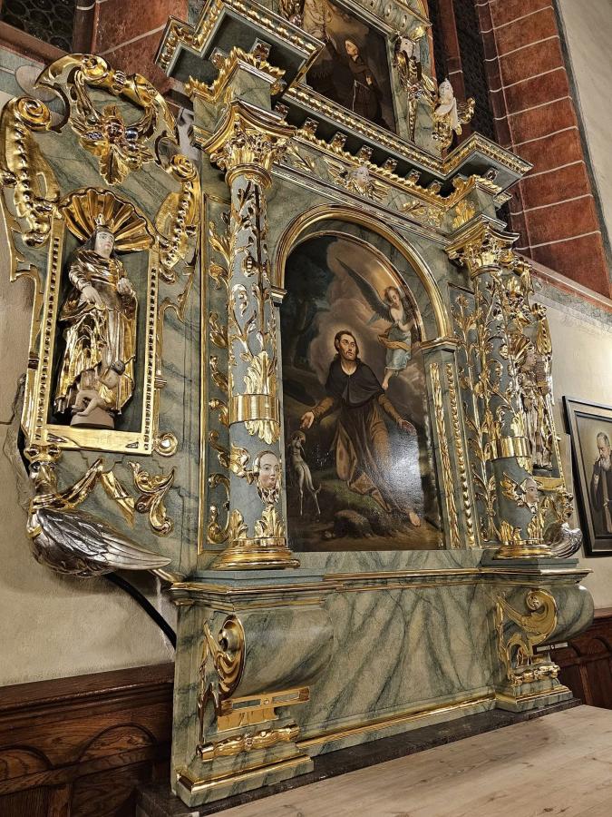 Galeria zdjęć: Ołtarz św. Rocha. Zdjęcia przedstawiają górną część ołtarza z obrazem św. Antoniego oraz postać św. Rocha w tradycyjnym ubiorze, z laską i wiernym psem. Odkryj tajemnice życia i działalności tego świętego, który pozostaje symbolem nadziei i opieki w trudnych chwilach. Odkryj dziedzictwo świętości i oddaj hołd patronowi chroniącemu przed zarazami.