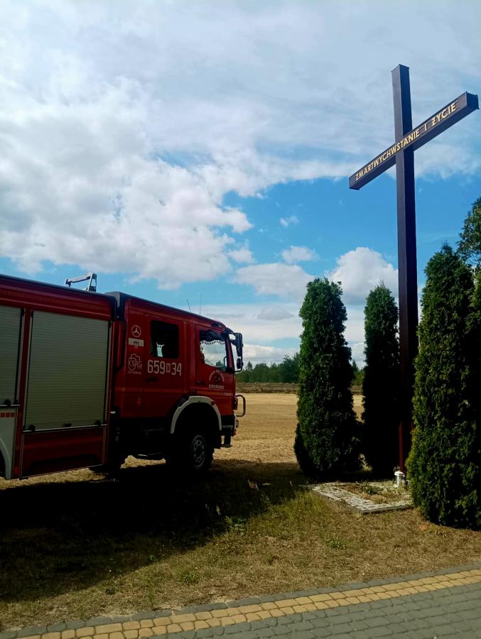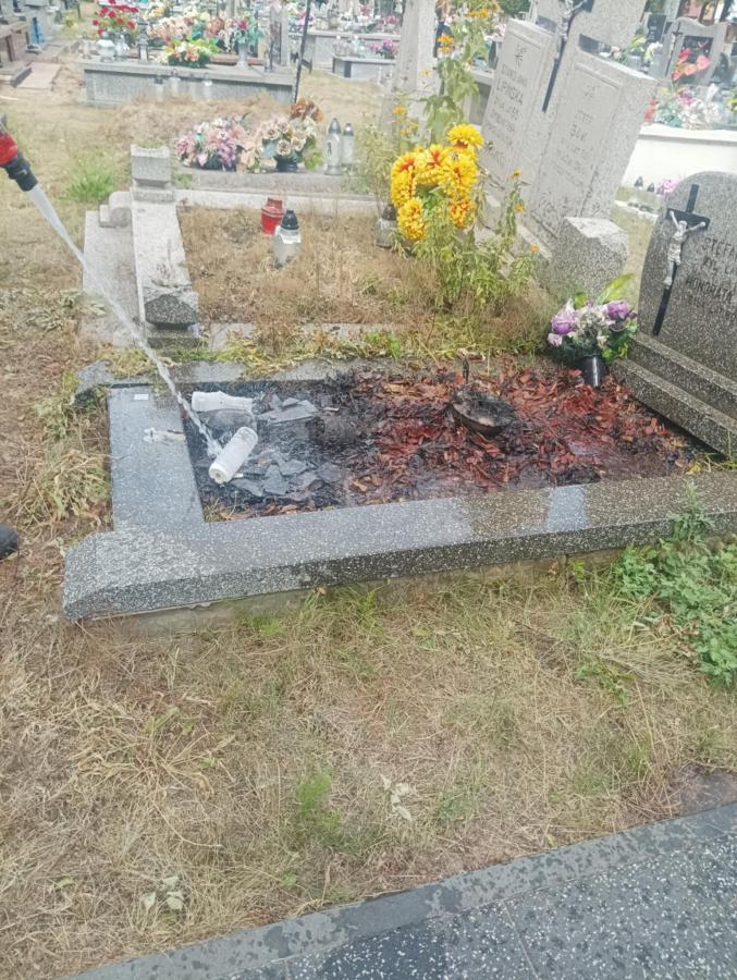 Pożar na cmentarzu Strażacy interweniują przy płonącym grobowcu. Szybka reakcja i wykorzystanie prądu wody pozwoliły ugasić ogień zanim rozprzestrzeniłby się na inne groby. Po kilkudziesięciu minutach akcja dobiegła końca, a nikt nie odniósł obrażeń.