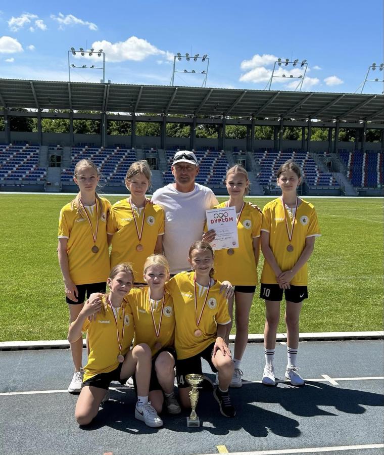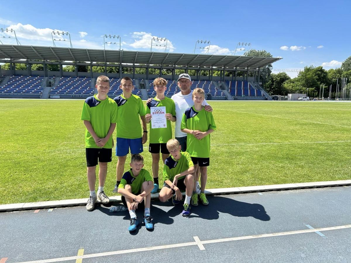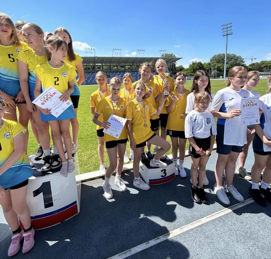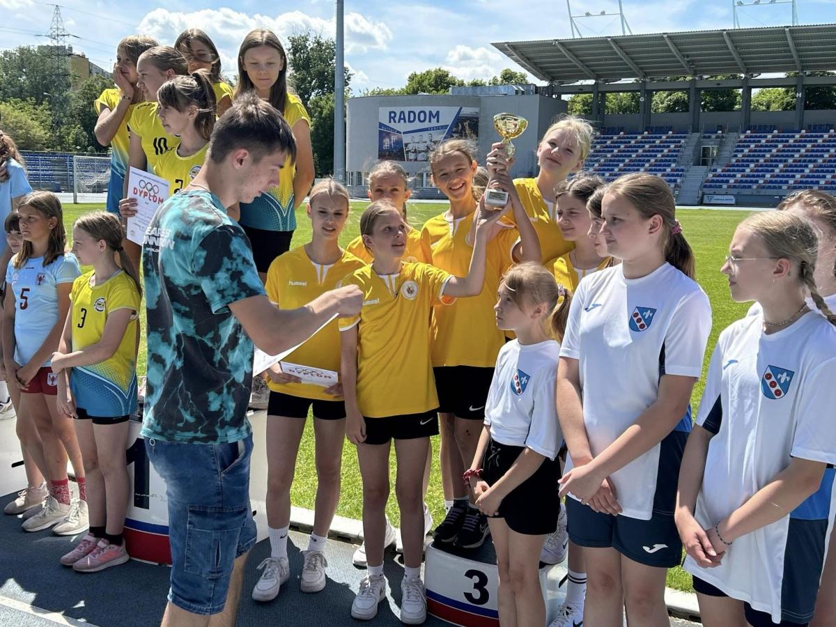 Galeria zdjęć prezentująca drużyny dziewcząt i chłopców z PSP nr 1 w Szydłowcu, które zdobyły brązowe medale i miejsce punktowane. Zawierają zdjęcia zawodniczek i zawodników oraz ich opiekuna Marka Artura Koniarczyka. Gratulujemy sukcesów i życzymy kolejnych triumfów!