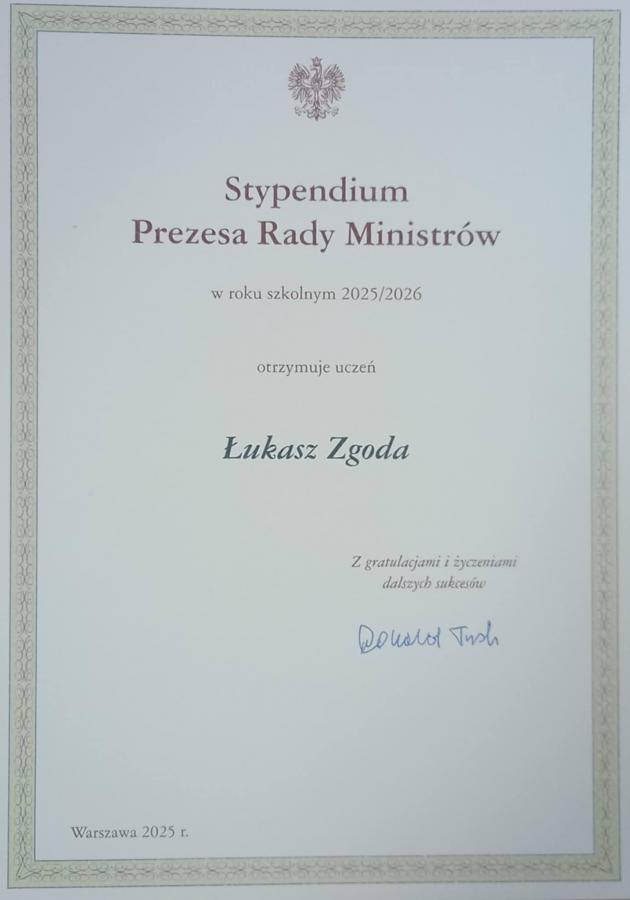 Sukces ucznia szydłowieckiego liceum – Łukasz Zgoda ze stypendium Prezesa Rady Ministrów