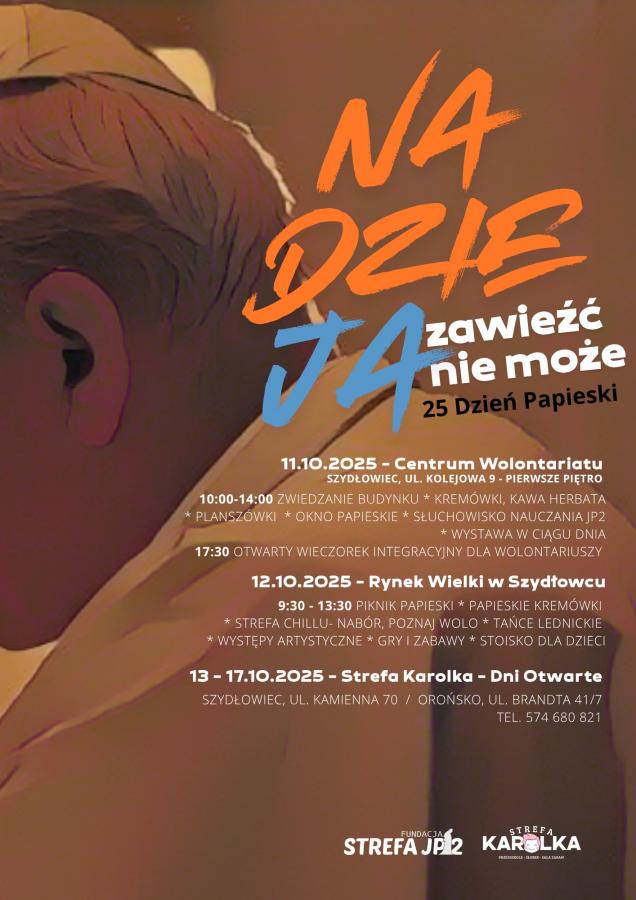 Zbliżają się Dni Papieskie, a wraz z nimi niezapomniany smak kremówek! Strefa JP2 - Fundacja serdecznie zaprasza na XXV Dzień Papieski pod hasłem Św. Jan Paweł II. Prorok Nadziei. Sobota (11 października) to Dzień Otwarty od 10:00 do 14:00 - kawa, zwiedzanie i kremówki czekają na ul. Kolejowej 9. Niedziela (12 października) to Piknik Papieski na Rynku Wielkim w Szydłowcu z kremówką w roli głównej. Kremówki będą też dostępne m.in. w Parafiach: Orońsko, Wysoka, Sadek. Dołącz do Centrum Wolontariatu i celebrowanie Papieskiego Weekendu pełnego dobra i miłości!